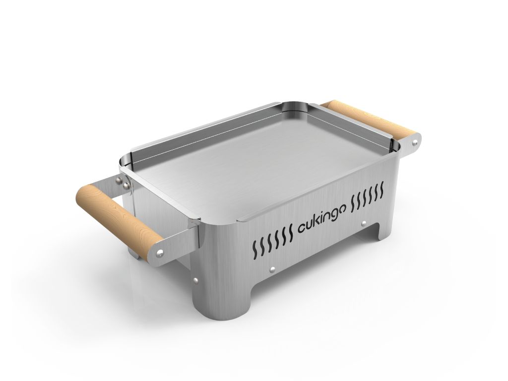 Diseñado 100% de Acero Inoxidable posee una bandeja lisa de acero inoxidable desmontable en donde también podrás colocar la Bandeja Cukingo Grande o la Brochetera Cukingo.