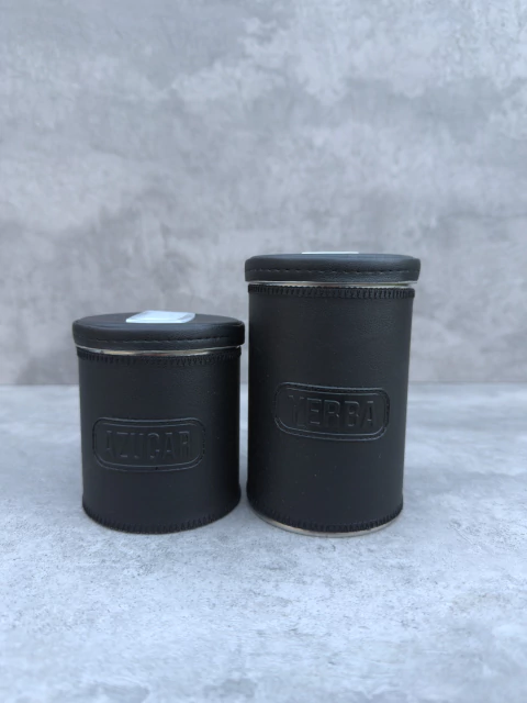 El Set de Latas Classic está confeccionado en cuero ecológico 100% cruelty free, lo que lo hace resistente, fácil de limpiar y práctico. Cada lata tiene una inscripción de plástisol al tono que indica su uso: «yerba» o «azúcar».